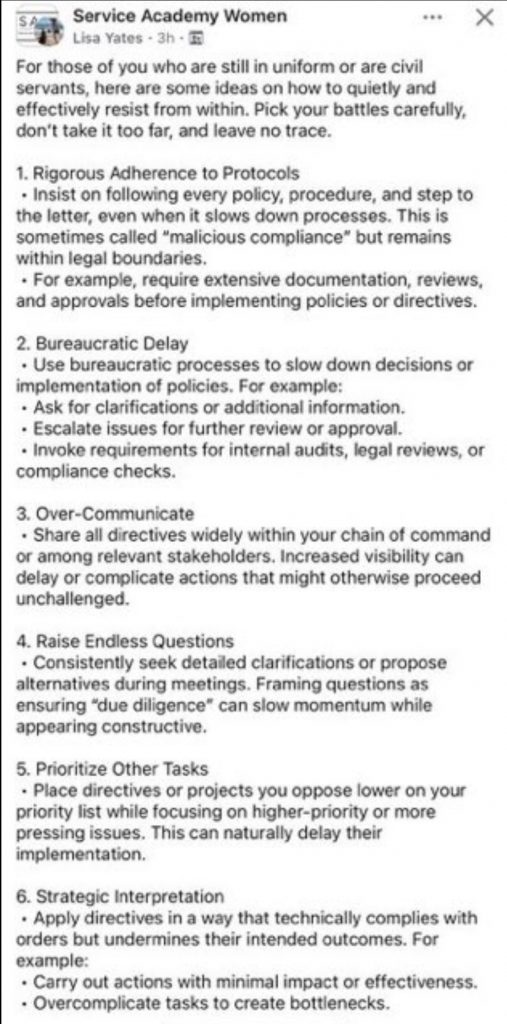 About the time that these events were occurring, I came across a post on social media that was supposedly from a female former Army intelligence officer. She addressed “Service Academy Women” and gave them tips on how to “resist.” In addition, I found a reference to an older document from which this social media post might have been taken. Here are the two documents: